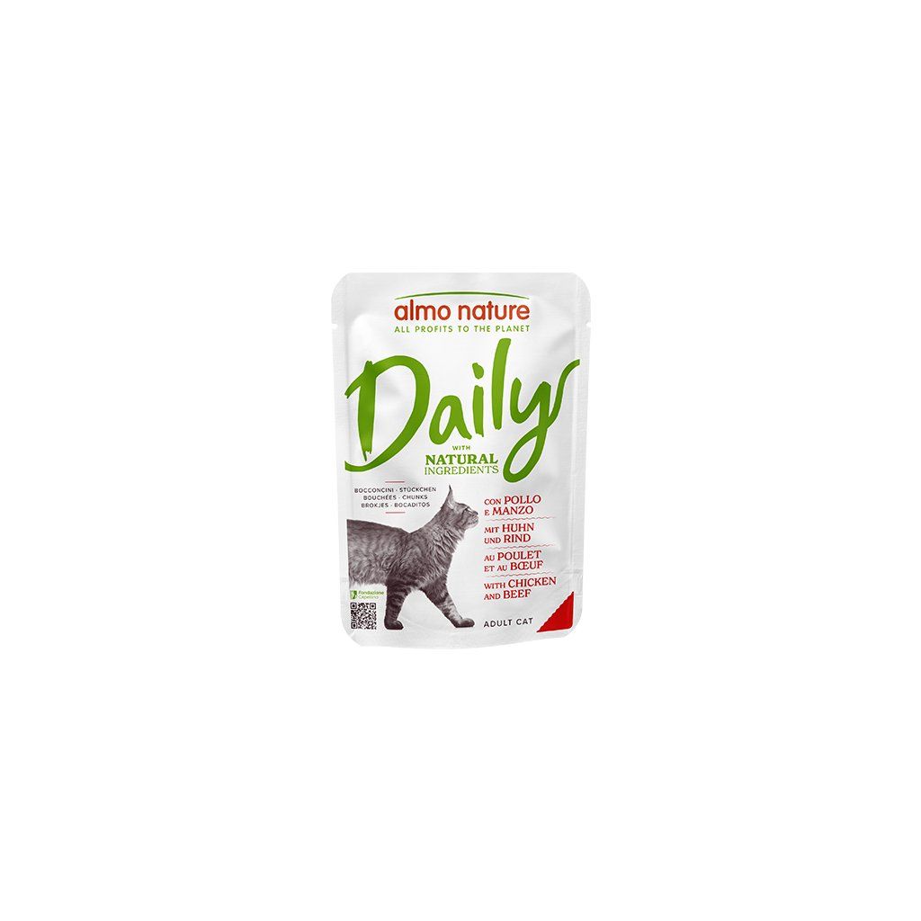 Almo Nature Daily with Chicken and Beef 70 g je kompletná kapsička pre dospelé mačky od 1 roka, vhodná na každodenné kŕmenie. Kombinácia kuracieho a hovädzieho ponúka výraznú mäsovú chuť, vysokú šťavnatosť a vyváženú výživu doplnenú o taurín, vitamíny a minerály.