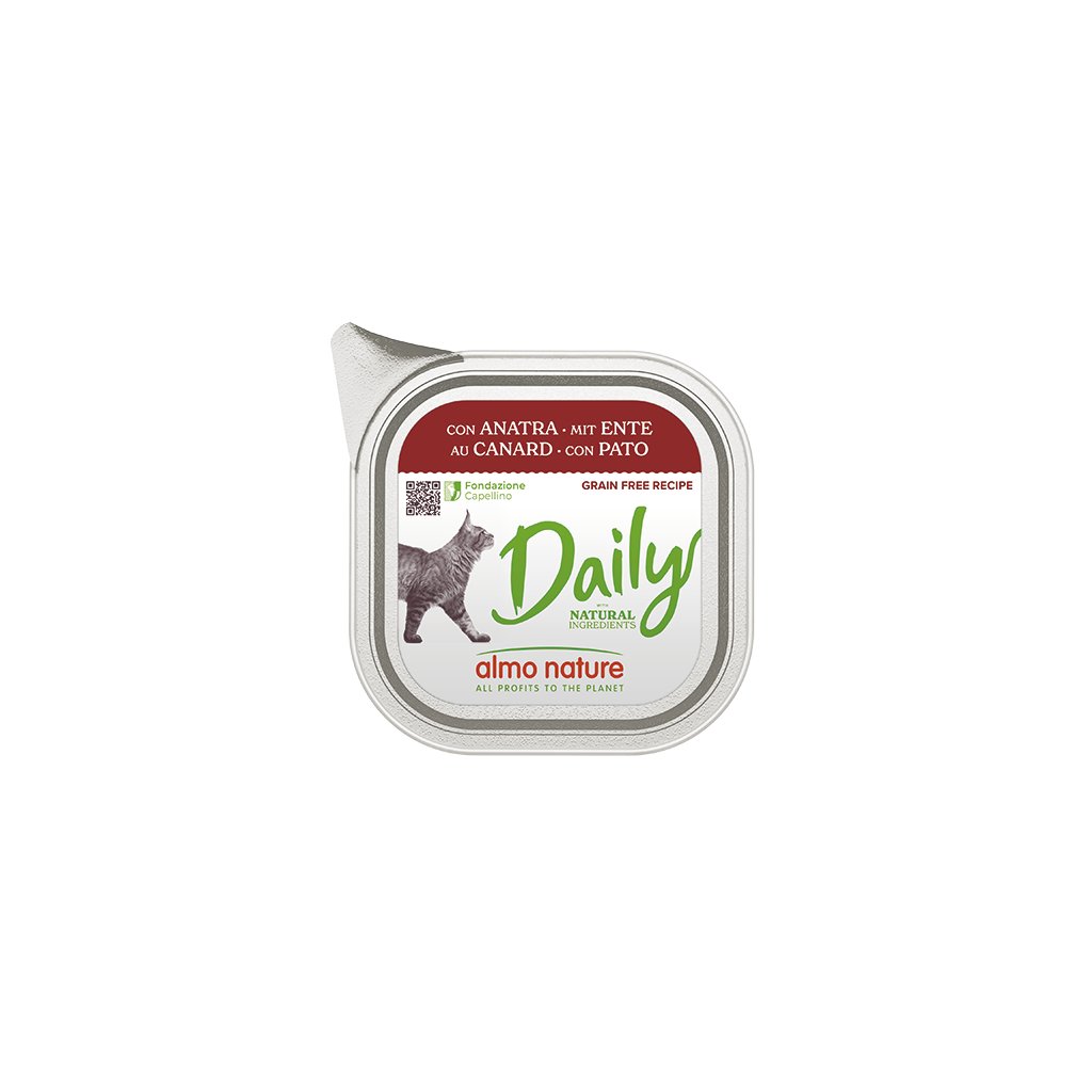 Almo Nature Daily with Duck 100 g je kompletné vlhké krmivo pre dospelé mačky od 1 roka. Receptúra s kačacím mäsom je gluten free a grain free (bez pridaných obilnín), takže je vhodná pre chovateľov, ktorí preferujú krmivo bez lepku a bez cereálií – zároveň s vysokou vlhkosťou pre podporu prirodzeného príjmu tekutín.
