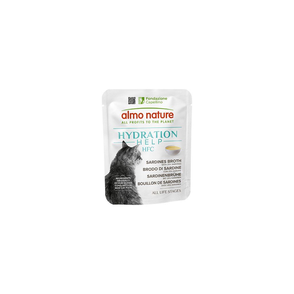 Almo Nature HFC Hydration Help Sardines Broth with Sardines je doplnkové krmivo pre mačky vo forme sardinkového vývaru s kúskami sardiniek. Pomáha podporiť hydratáciu, zvýšiť chutnosť stravy a je vhodné pre mačiatka 2–12 mesiacov, dospelé mačky 1+ rok aj seniorov 7+ rokov.