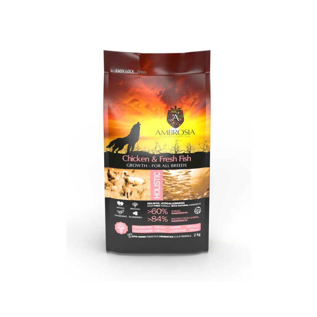 Ambrosia Chicken & Fresh Fish je holistické, hypoalergénne a bezobilninové krmivo pre šteňatá všetkých plemien. Receptúra s kuracím mäsom a čerstvou rybou poskytuje optimálnu výživu pre zdravý rast, podporu trávenia, vývoj kostí, svalov a celkovú vitalitu mladého psa.