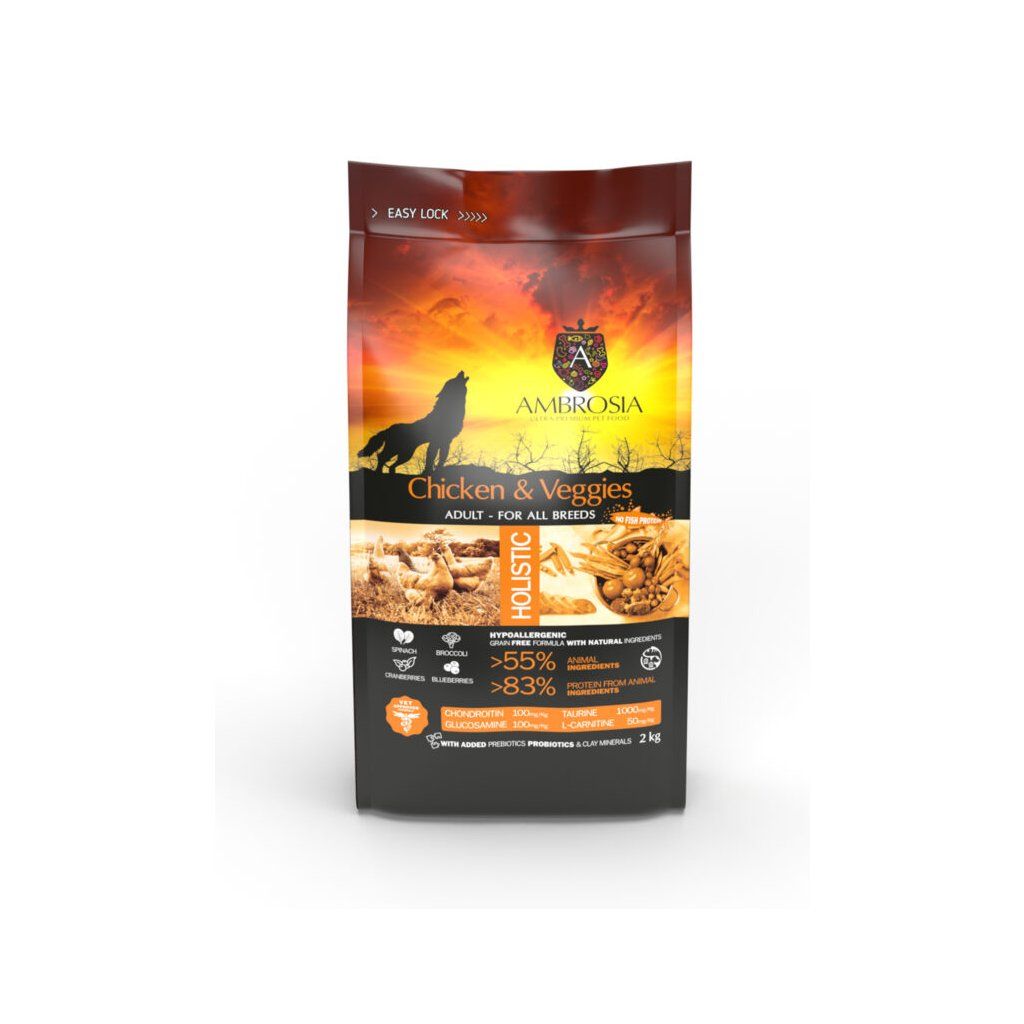 Ambrosia Chicken & Veggies je holistické, hypoalergénne a bezobilninové krmivo pre dospelých psov všetkých plemien. Receptúra s kuracím mäsom a zeleninou poskytuje vyváženú každodennú výživu, podporuje trávenie, imunitu, zdravú kožu, lesklú srsť aj správnu funkciu kĺbov.