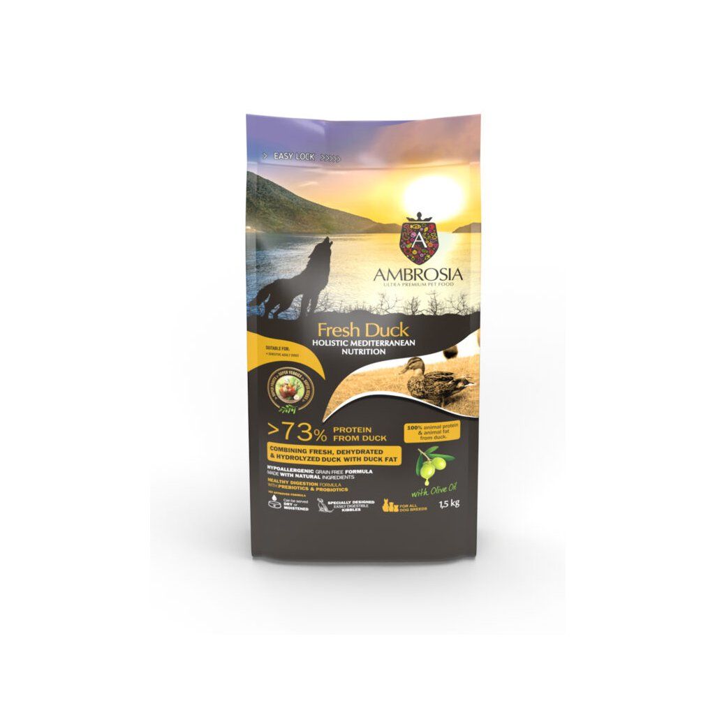 Ambrosia Fresh Duck je holistické bezobilninové krmivo v stredomorskom štýle pre dospelých citlivých psov všetkých plemien. Receptúra s čerstvou kačicou, olivovým olejom, ovocím a bylinkami podporuje zdravé trávenie, imunitu, zdravú kožu, lesklú srsť a celkovú vitalitu psa.