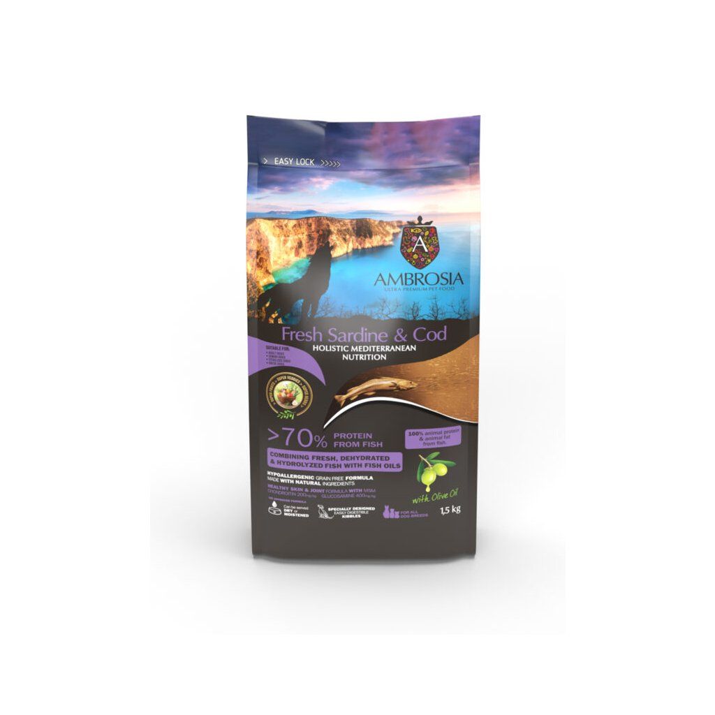 Ambrosia Fresh Sardine & Cod je holistické bezobilninové krmivo v stredomorskom štýle, určené pre dospelých psov, seniorov, sterilizované psy a psy so sklonom k obezite. Receptúra so sardinkou a treskou ponúka ľahko stráviteľné rybie bielkoviny, nižší obsah tuku, vysoký podiel omega 3 a podporu trávenia, kĺbov, metabolizmu aj celkovej vitality.
