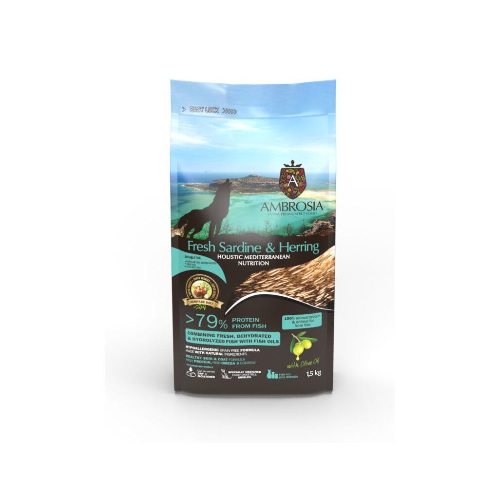 Ambrosia Fresh Sardine & Herring je holistické bezobilninové krmivo v stredomorskom štýle, vhodné pre šteňatá, dojčiace sučky, mladé psy aj aktívnych dospelých psov všetkých plemien. Receptúra s čerstvou sardinkou a sleďom poskytuje vysoký podiel kvalitných rybích bielkovín, podporuje rast, vitalitu, zdravú kožu, lesklú srsť aj každodennú kondíciu.