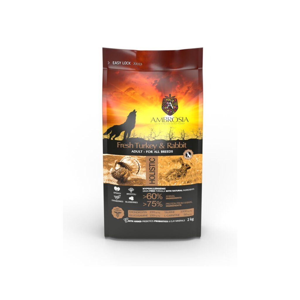 Ambrosia Fresh Turkey & Rabbit je holistické, hypoalergénne a bezobilninové krmivo pre dospelých citlivých psov všetkých plemien. Receptúra s morčacím a králičím proteínom je navrhnutá pre podporu trávenia, imunity, zdravých kĺbov, krásnej srsti a celkovej vitality.