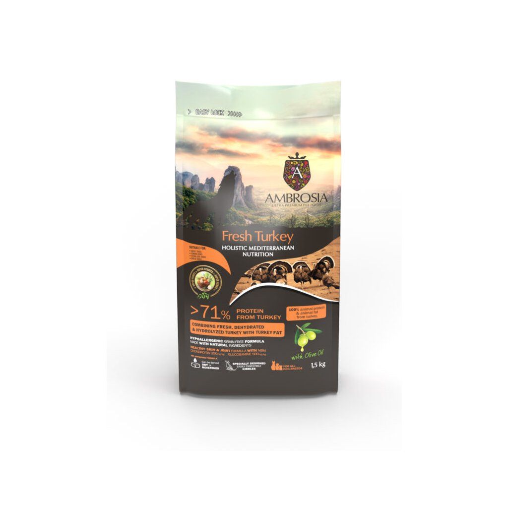 Ambrosia Fresh Turkey je holistické bezobilninové krmivo v stredomorskom štýle pre dospelých psov, citlivé psy, sterilizované psy a psy so sklonom k nadváhe. Single protein receptúra s morčacím mäsom ponúka kvalitné bielkoviny s nižším obsahom tuku, podporuje trávenie, vitalitu, zdravé kĺby, optimálnu kondíciu aj každodennú pohodu psa.