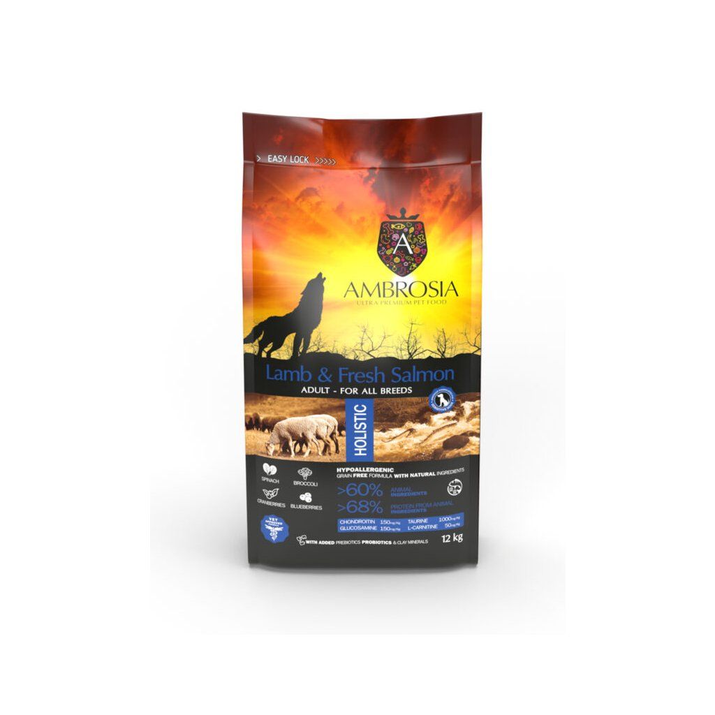 Ambrosia Lamb & Fresh Salmon je holistické, hypoalergénne a bezobilninové krmivo pre dospelých psov, špeciálne vyvinuté pre citlivých psov. Receptúra s jahňacím mäsom a čerstvým lososom poskytuje kvalitné bielkoviny, podporuje zdravé trávenie, imunitu, kožu, srsť aj pohybový aparát a je vhodná pre všetky plemená.