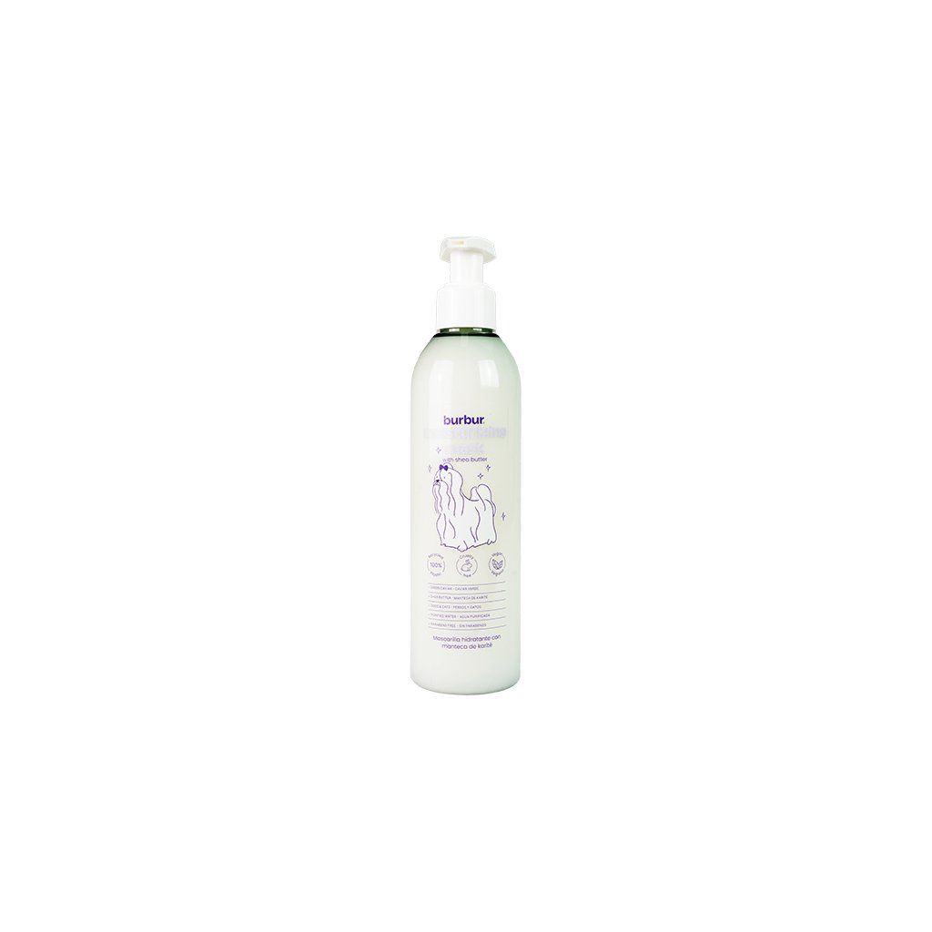 Hydratačná maska s bambuckým maslom, 250 ml je doplnková starostlivosť po kúpaní určená pre psy aj mačky, ktorým chcete dopriať extra hydratáciu, výživu a ochranu. Obsahuje výťažok zo zeleného kaviáru a bambucké maslo – vďaka týmto ingredienciám pomáha hĺbkovo opravovať, chrániť a vyživovať srsť aj pokožku, aby bola srsť po vysušení jemná a lesklá.