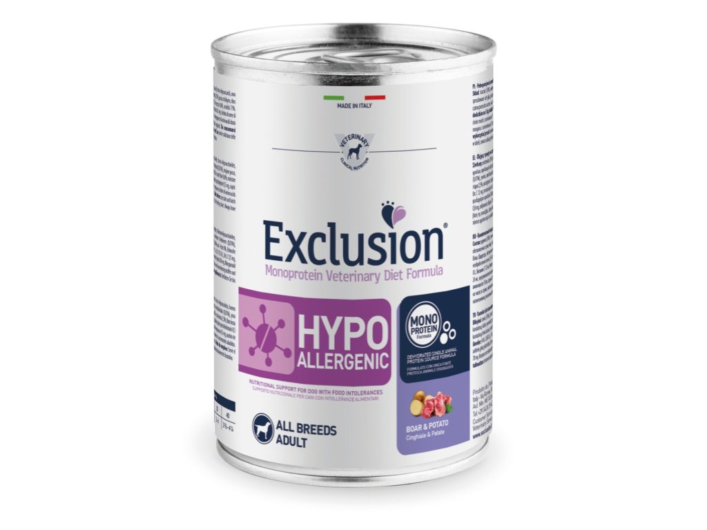 Exclusion Hypoallergenic Boar & Potato All Breeds sú špeciálne veterinárne konzervy pre psy všetkých plemien s citlivým trávením alebo potravinovými alergiami. Receptúra s diviačím mäsom a zemiakmi poskytuje vysoko stráviteľnú, hypoalergénnu a kompletnú výživu.