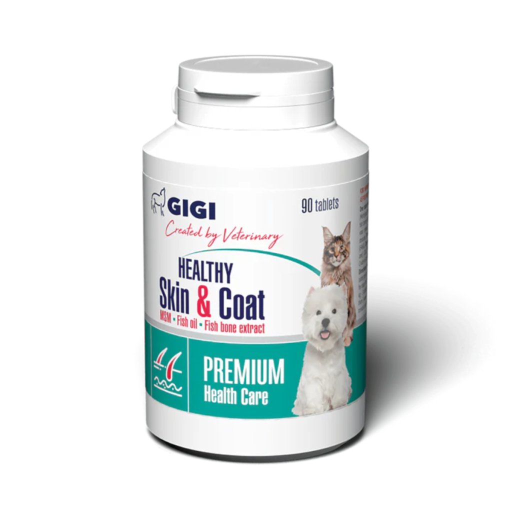 Gigi Vet PERFECT Skin & Coat je funkčný doplnok výživy pre psy a mačky všetkých veľkostí a veku, určený na podporu zdravej kože a kvalitnej srsti. Pomáha pri svrbení, podráždení kože, vypadávaní chlpov a je vhodný aj na preventívne používanie pre lesklú srsť a hydratovanú pokožku – prvé výsledky môžete vidieť spravidla do 1 mesiaca.