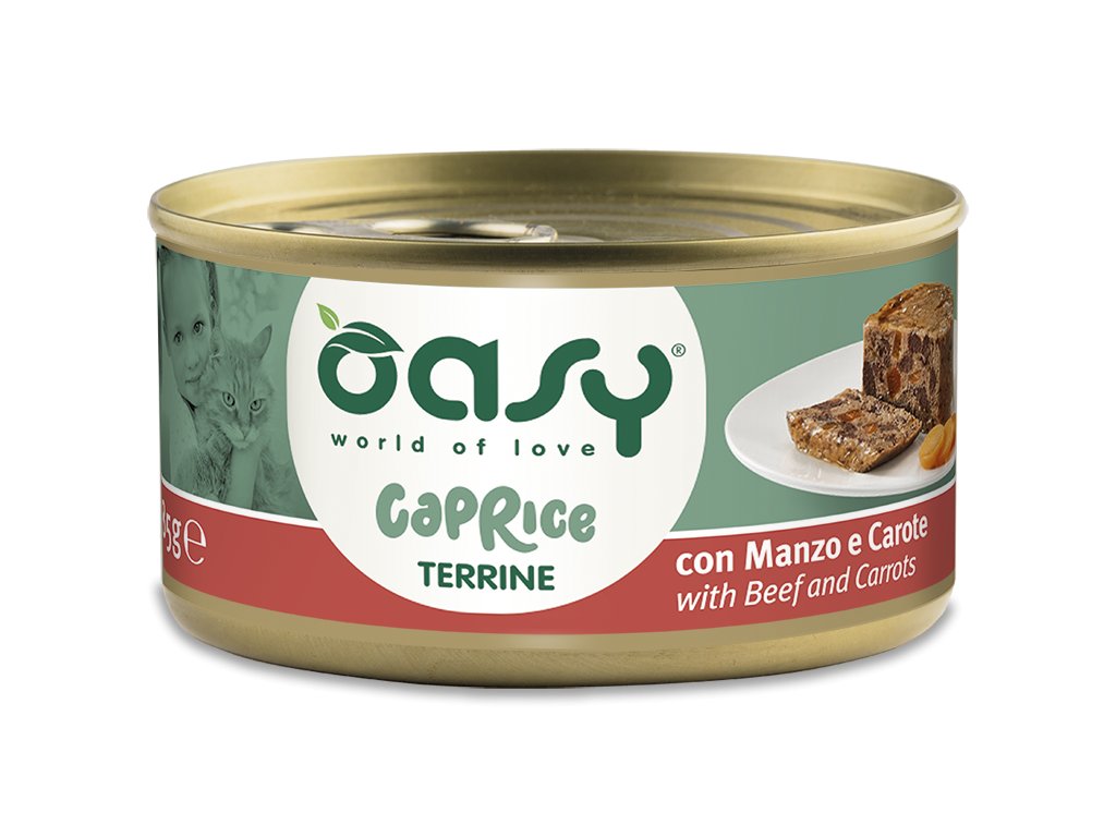 Oasy Caprice Terrine s hovädzím a mrkvou je kompletné krmivo pre dospelé mačky. Jemná textúra s kúskami hovädzieho a zeleniny poskytuje mačke skvelý chuťový zážitok každý deň.