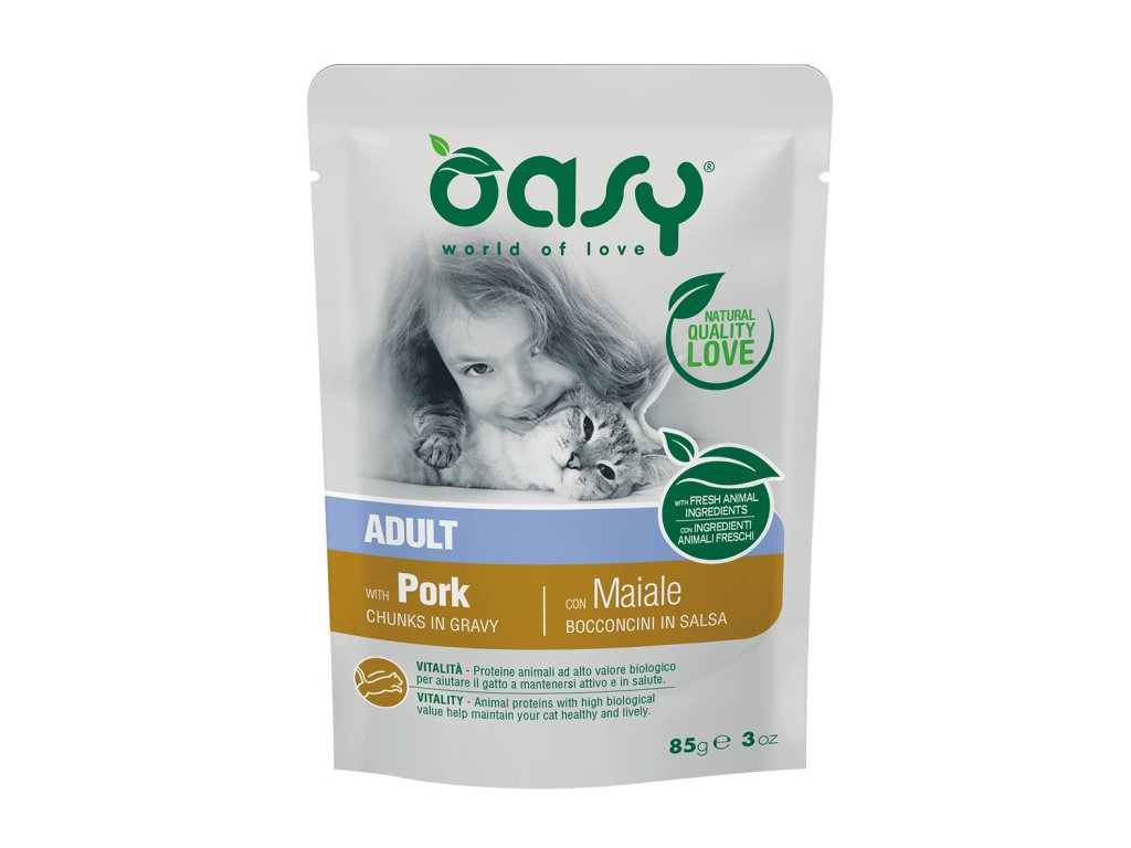Oasy Chunks in Gravy Adult s bravčovým mäsom je kompletné krmivo pre dospelé mačky. Lahodné šťavnaté kúsky v omáčke s bravčovým potešia aj vyberavé mačky a dodajú im všetky potrebné živiny.