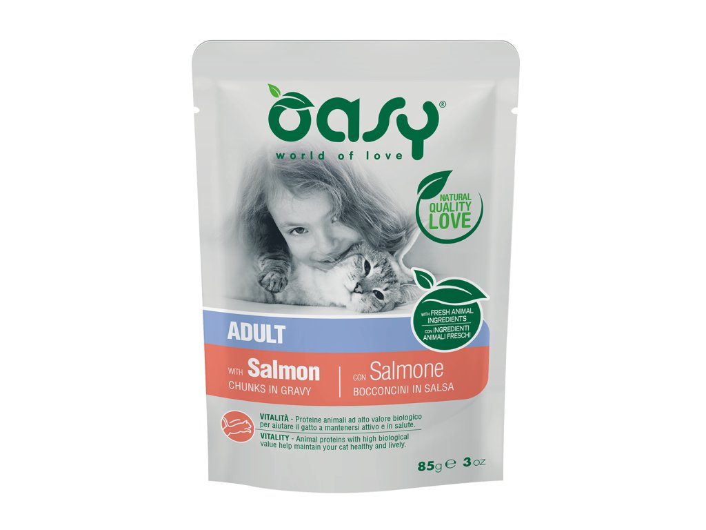 Oasy Chunks in Gravy Adult with Salmon je kompletné vlhké krmivo pre dospelé mačky s jemnými kúskami lososa v šťave. Receptúra bez lepku, farbív a umelých aróm podporuje vitalitu, chuť do jedla a každodennú pohodu vašej mačky.