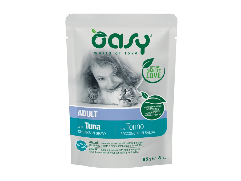 Oasy Chunks in Gravy Adult with Tuna je kompletné vlhké krmivo pre dospelé mačky s jemnými kúskami tuniaka v lahodnej šťave. Šetrná receptúra bez lepku, umelých farbív a dochucovadiel zaručuje nielen skvelú chuť, ale aj zdravú a vyváženú výživu.