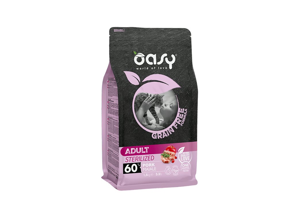 Oasy Grain Free Sterilized Pork sú prémiové bezobilninové granule špeciálne určené pre sterilizované mačky. Obsahujú chutné bravčové mäso ako jediný zdroj živočíšnych bielkovín, pomáhajú udržiavať ideálnu hmotnosť a zároveň podporujú zdravé trávenie a vitalitu.