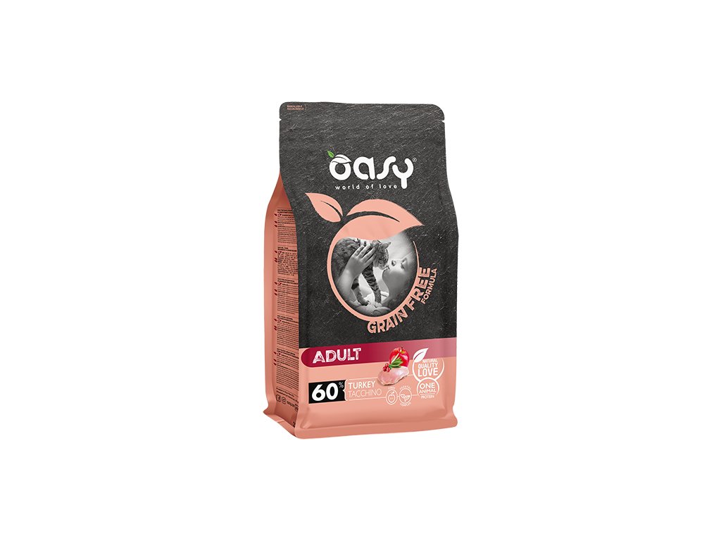 Oasy Grain Free Adult Turkey sú prémiové bezobilninové granule pre dospelé mačky, ktoré obsahujú chutné morčacie mäso ako hlavný zdroj živočíšnych bielkovín. Receptúra bez obilnín podporuje zdravé trávenie, vitalitu a spokojnosť vašej mačky.