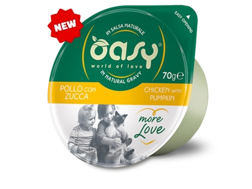 Oasy MoreLove Chicken with Pumpkin Cup je chutná krémová konzerva pre mačky s kuracím mäsom a prídavkom tekvice. Poskytuje vyváženú výživu, podporuje zdravé trávenie a je vhodná ako každodenná strava alebo doplnok k suchému krmivu.