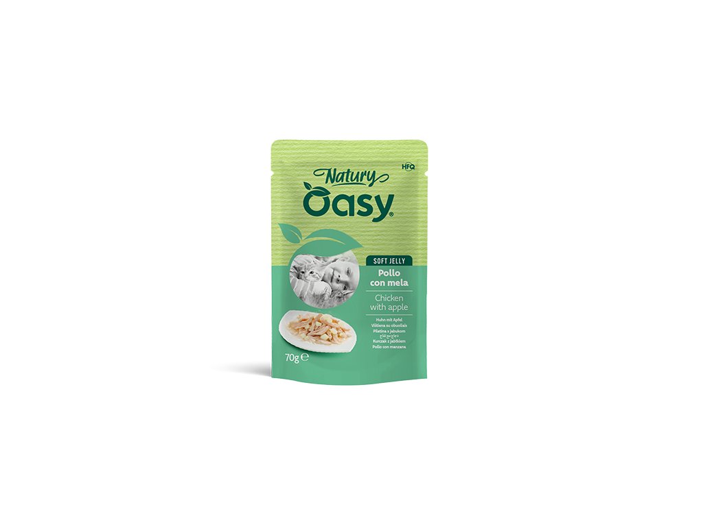 Oasy Natury Soft Jelly Chicken with Apple je kompletné mokré krmivo pre dospelé mačky. Spája kvalitné kuracie mäso s kúskami jablka v jemnej želé, čím ponúka nielen skvelú chuť, ale aj prirodzený zdroj vlákniny pre zdravé trávenie.