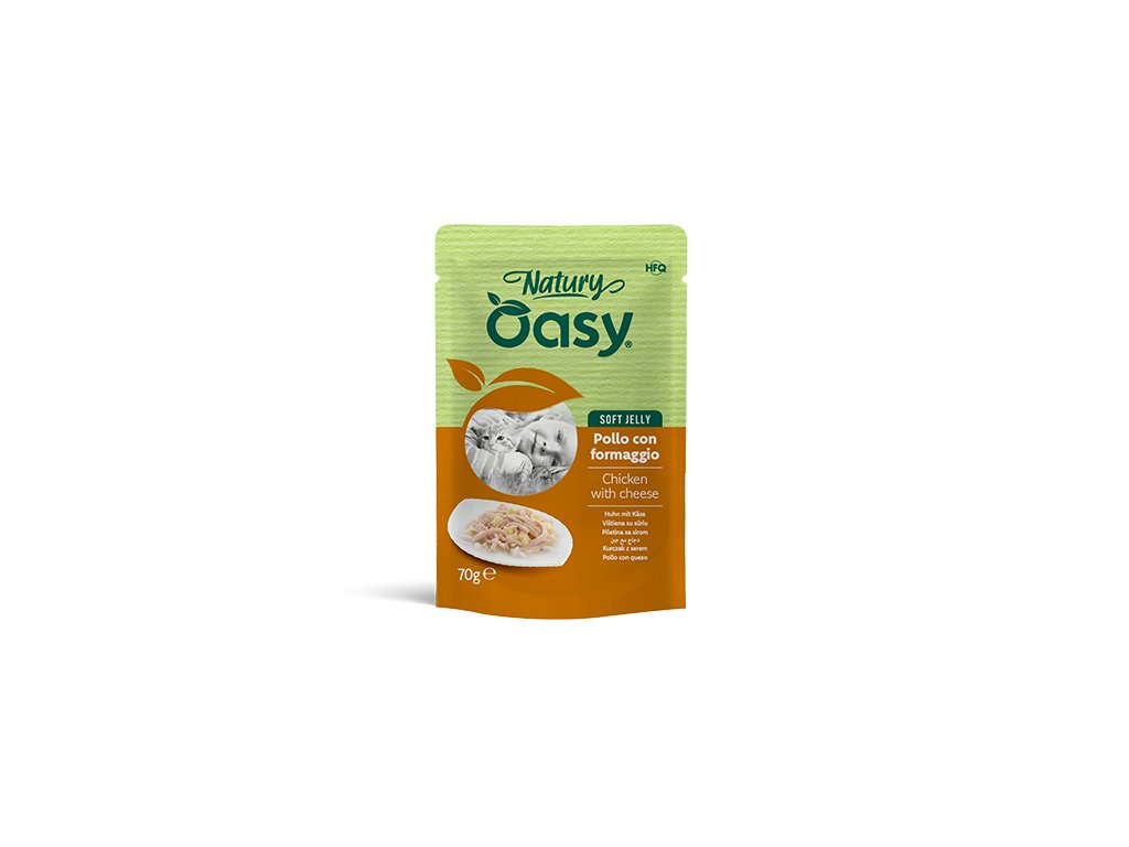 Oasy Natury Soft Jelly Chicken with Cheese je kompletné mokré krmivo pre dospelé mačky, ktoré spája jemné kuracie mäso a chutný syr v lahodnej želé. Poskytuje vyváženú výživu, prirodzenú chuť a poteší aj mačky s náročnejším apetítom.