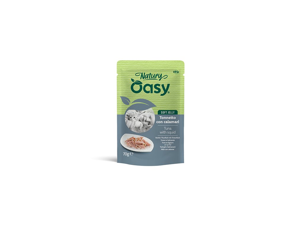 Oasy Natury Soft Jelly Tuna with Squid je prémiové mokré krmivo pre dospelé mačky, kombinujúce kvalitný tuniak a sépiu v jemnej želé. Podporuje zdravie, vitalitu a lesklú srsť vašich mačiek.