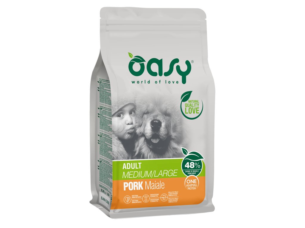 Oasy One Animal Protein Adult Pork Medium/Large je kompletné bezobilninové krmivo pre dospelých psov stredných a veľkých plemien. Vďaka jedinému živočíšnemu zdroju bielkovín – bravčovému mäsu – je ideálne aj pre psy s citlivým trávením alebo potravinovými intoleranciami.