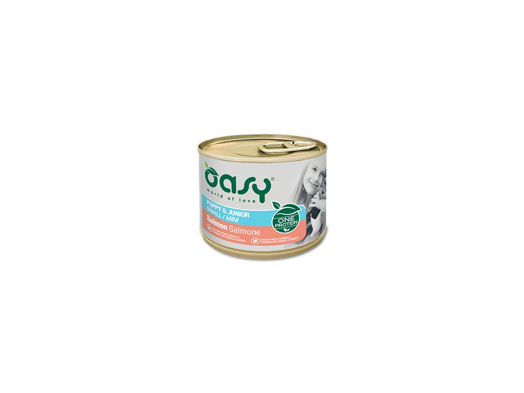 Oasy One Protein Puppy Salmon Small & Mini je kompletné vlhké krmivo s lososom určené pre šteňatá malých a mini plemien. Podporuje zdravý rast, vývoj kostí, imunitu a celkovú vitalitu od prvých mesiacov života.