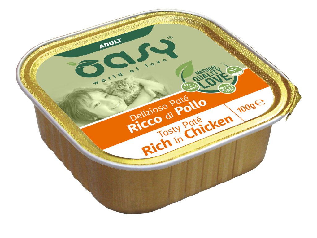 Oasy Tasty Paté Adult Rich in Chicken je kompletné krmivo pre dospelé mačky. Lahodná paštéta s kuraťom poskytuje vysokú stráviteľnosť, kvalitné bielkoviny a vyváženú výživu každý deň.