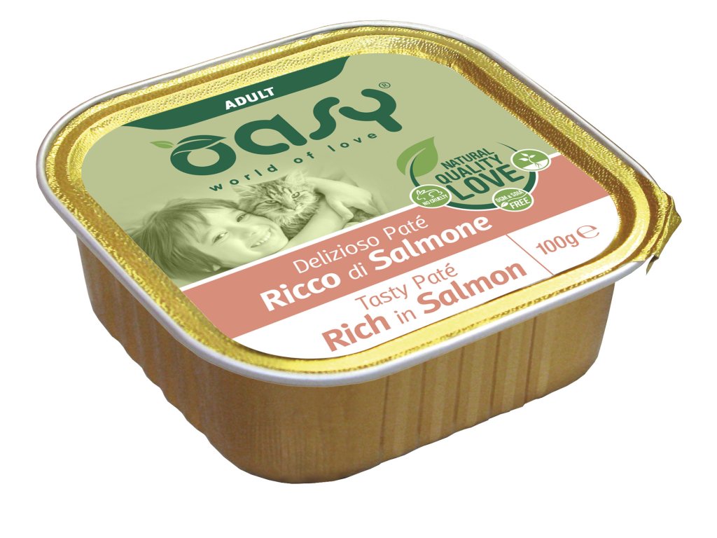 Oasy Tasty Paté Adult with Salmon je kompletné krmivo pre dospelé mačky s vysokým obsahom chutného lososa. Lahodná paštéta bez obilnín podporuje zdravie, energiu a vitalitu vašej mačky každý deň.
