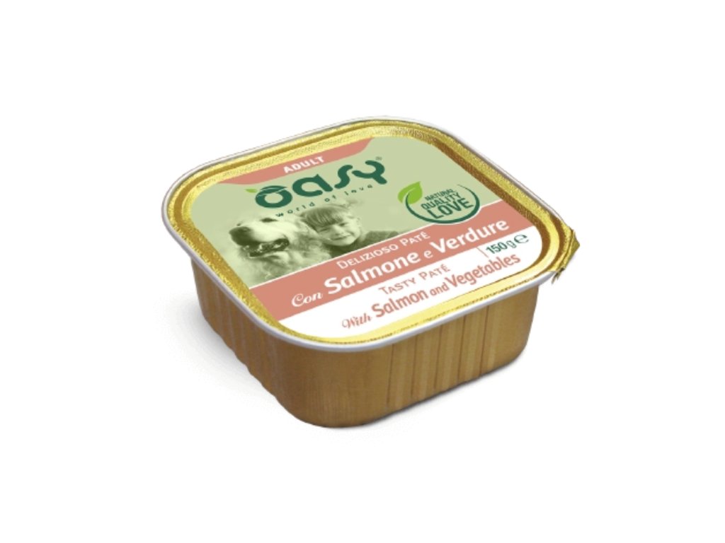 Oasy Tasty Paté Adult s lososom a zeleninou je kompletné mokré krmivo vo forme jemnej paštéty, špeciálne vyvinuté pre dospelých psov. Kombinuje lahodné rybie mäso a zeleninu, čím poskytuje vyváženú výživu, podporuje zdravie kože a lesklú srsť.