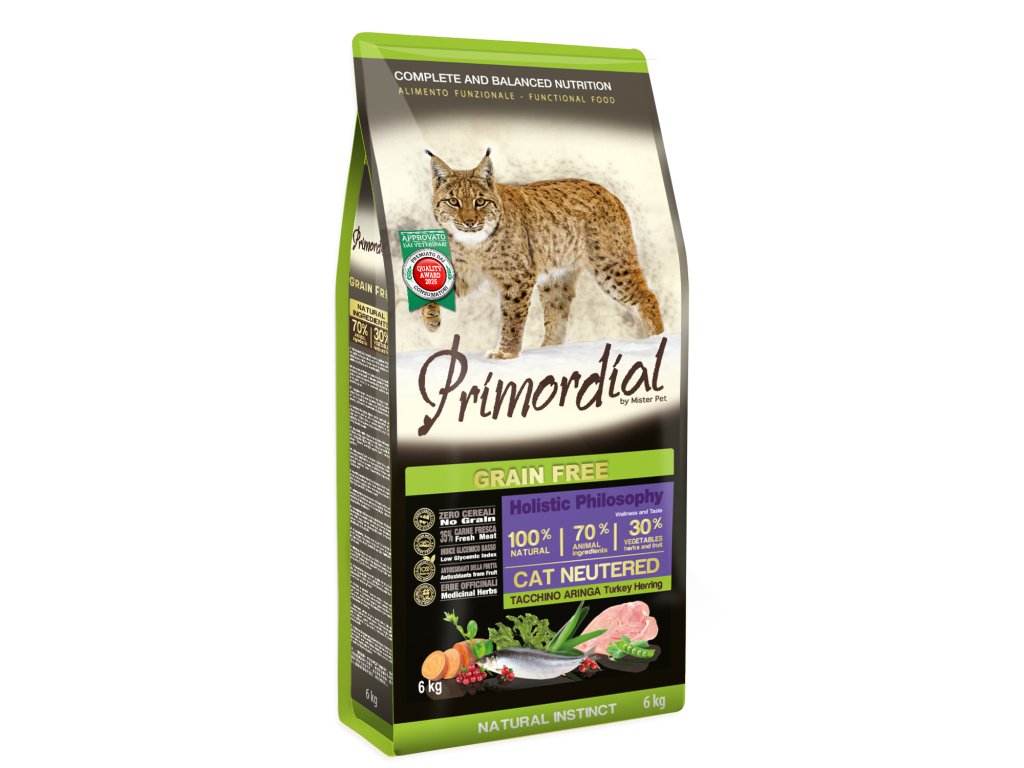 Primordial Cat Sterilized Turkey & Herring je kompletné bezobilné krmivo určené pre sterilizované mačky všetkých plemien. Obsahuje kvalitné mäso z morčacieho mäsa a sleďa, podporuje zdravie močových ciest, trávenie, imunitu a lesklú srsť.